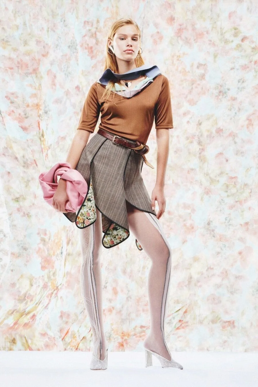 Leaning towards a maximalist theme, Y/Project’s most recent collection plays with layering textures, patterns and color that draw one’s eye into the lookbook. Playing with denim jeans waistlines in dramatic shapes like deep “v’s” and pronounced pockets aren’t only restricted to pants but floor length jackets as well. What’s even more interesting than the complex approach to styling in this “Evergreen” collection is that all of these pieces are the brand’s most recognizable garments but they have been reimagined in a sustainable, environmentally friendly way. This collection definitely has layers to it - and we mean that literally and figuratively. These familiar garments from collections past are imagined in new ways, truly pointing out how versatile they can be from many viewpoints. For example, a brown, cream and yellow wool sweater is shown worn under a dress and the same sweater is also shown worn with a bralette top and trench coat. Perhaps our favorite looks are those that present themselves to be more feminine. Deconstructed menswear shirts make suggestive striped dresses with cutout detailing and are paired with white tights and kitten heels.